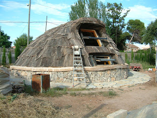 Una vez terminada esta parte, empezamos a cortar y unir maderas (reutilizadas, de otros usos anteriores) para hacer un "encofrado" en la base del interior del domo, para aislar de la humedad.